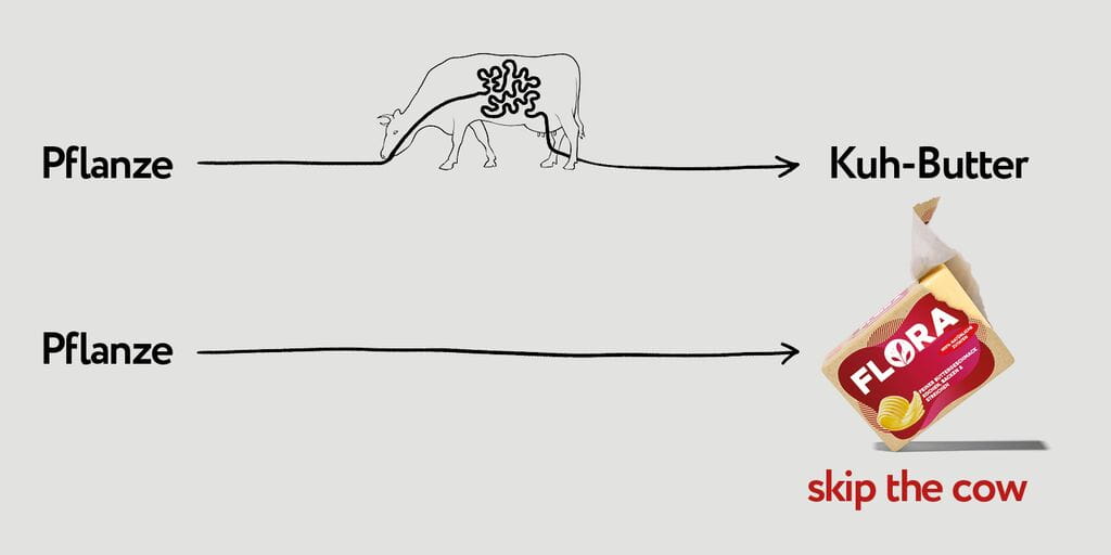 Und wenn man dann darüber nachdenkt, dass Flora bei vollem Geschmack auch noch 100% pflanzlich ist, kann man kaum glauben, dass eben diese Pflanzen sonst den Umweg durch eine Kuh machen würden, um daraus Butter herzustellen.
